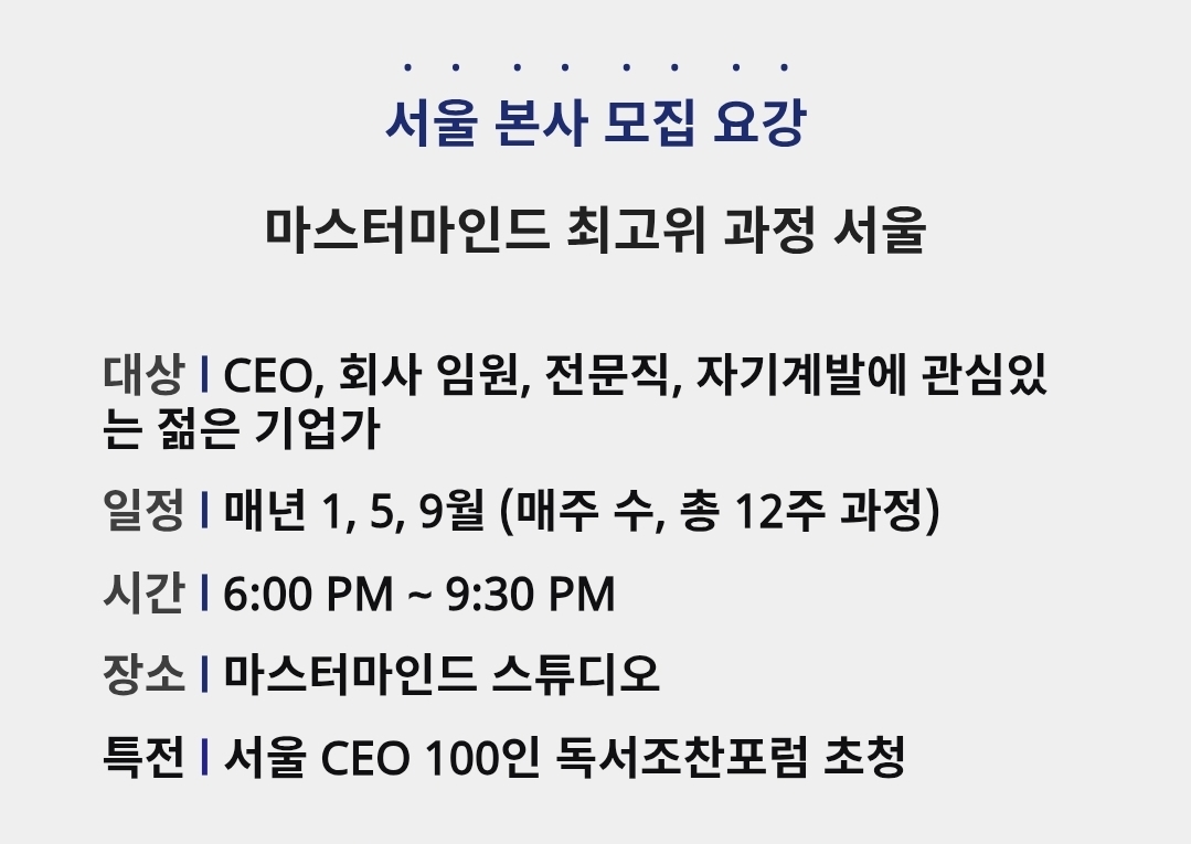대상 : CEO, 회사 임원, 전문직, 자기계발에 관심있는 젊은 기업가